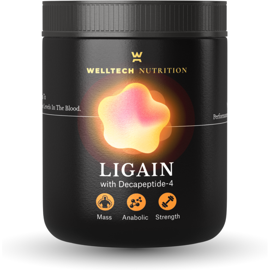 Ligain by Welltech Nutrition is a dietary supplement intended for adults to be used as part of a balanced daily nutrition plan within a varied diet. The packaging features a dark bottle with a white cap and a label that showcases a bright, glowing abstract design.