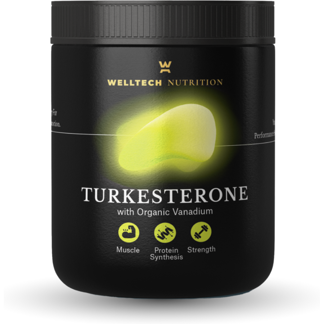 Dietary supplement for adults intended for daily use. Turkesterone capsule supplement from Welltech Nutrition, presented in a dark amber bottle with a white screw-cap, featuring a label that highlights Turkesterone with Organic Vanadium.